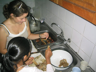 Bertha og meg i full gang med aa ta ut de froa som egentlig ikke skulle tas ut av de hvite auberginene.Paa kveldene er vi som oftest paa senteret, men sondag 30.mars var vi faktisk ute av senteret i bursdagen til ingen ringere enn broren til mannen til direktøren på mødresenteret, som fylte 71 år. De var til sammen sju brødre, konene deres, barn og barnebarn, en passe stor gjeng med godt voksne mennesker for å si det på den måten. Midt i denne gjenge var da vi. Det ble leking, stolleken og ”mumien”, kake og piñata. Vi fikk æren av å følge bursdagsbarnet(som hadde bind for øynene) fram til piñata’en, og etter å ha snurra 5 runder, og masse slåing med et plastballtre var det bare å løpe etter godteri. Tilslutt, men ikke minst var det tid for dansing. Ingen peruansk fest uten dans! Alle danser, store som små, og ingen kommer unna, inkludert en nordmann uten danseferdigheter, men gøy var det uansett! Viser litt om hvor gjestfrie peruanere er, med tanke på at vi var i bursdagen til broren til mannen til direktøren på mødresenteret. Paa lordag skal vi faktisk i 1-aarsdagen til barnebarnet til sjefen ogsaa:)